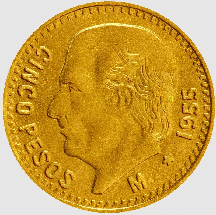 El 5 pesos Hidalgo forma parte de la familia de monedas de oro mexicanas del siglo XX, acuñadas para representar valor real en metal, no simbólico.